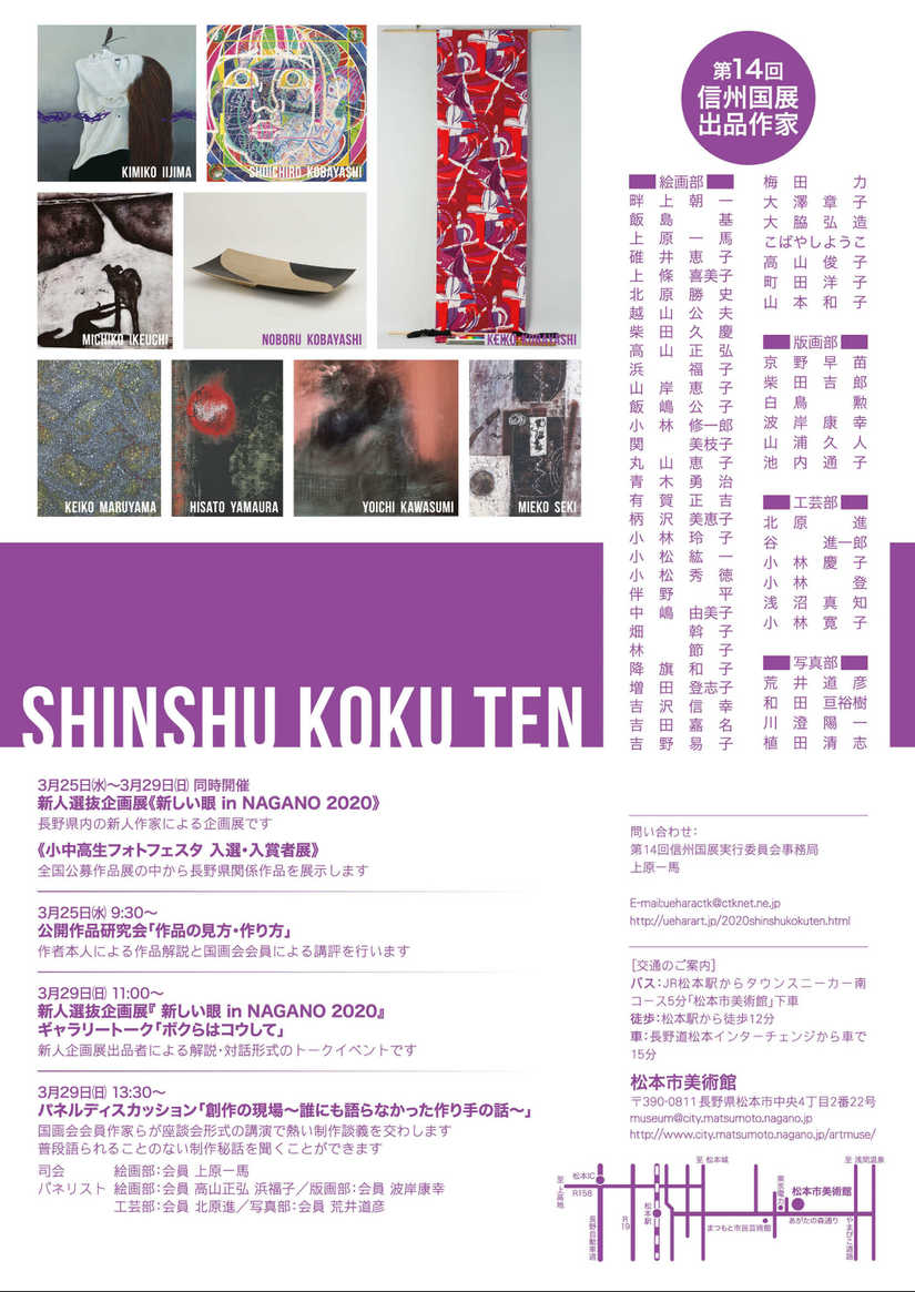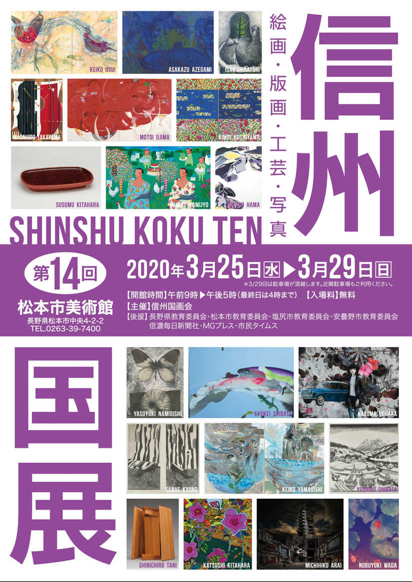 | 「第14回 信州国展」・「新しい眼 in NAGANO 2020」は、 新型コロナウィルス感染拡大防止のため、中止となりました。 (期日を改め開催する予定です。) |