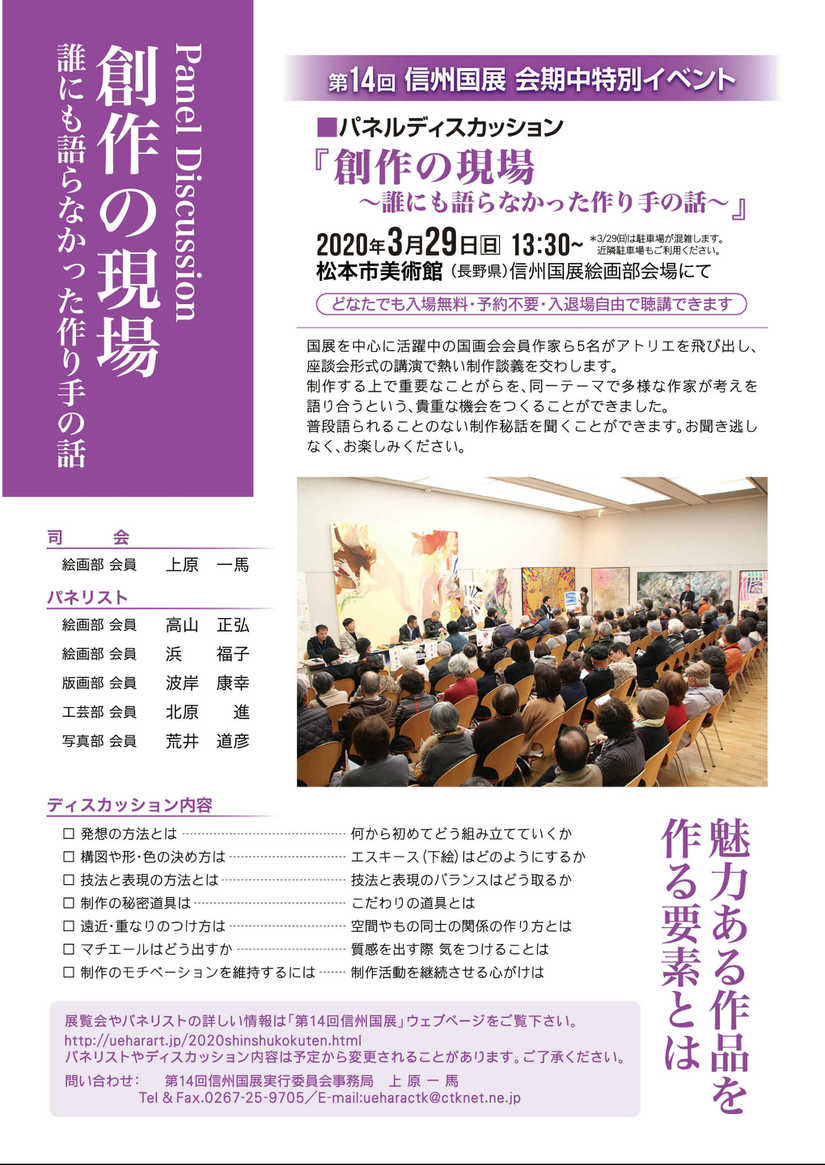 ・ ■パネルディスカッション「創作の現場~誰にも語らなかった作り手の話~」 2020年3月29日(日) 13:30~ 国画会会員作家ら5名がアトリエを飛び出し、座談会形式の講演で熱い制作談義を交わします。 制作する上で重要なことがらを、同一テーマで多様な作家が考えを語り合うという、貴重な機会をつくることができました。普段語られることのない制作秘話を聞くことができます。 前回100数名以上が参加した人気のイベントです。作家のこころを聞いてみたい人や自分でも制作をしてみたい人におすすめです。お聞き逃しなく。 どなたでも無料・予約不要・入退場自由で聴講できます。 司 会 絵画部 会員‥‥上 原 一 馬 パネリスト 絵画部 会員‥‥高 山 正 弘 絵画部 会員‥‥浜 福 子 版画部 会員‥‥波 岸 康 幸 工芸部 会員‥‥北 原 進 写真部 会員‥‥荒 井 道 彦 ディスカッション内容 □ 発想の方法とは 何から始めてどう組み立てるか □ 構図や形・色の決め方は エスキース(下絵)はどのようにするか □ 技法と表現の方法とは 技法と表現のバランスはどう取るか □ 制作の秘密道具は こだわりの道具とは □ 遠近・重なりのつけ方は 空間やもの同士の関係の作り方とは □ マチエールはどう出すか 質感を出す際 気をつけることは □ 制作のモチベーションを維持するには 制作活動を継続させる心がけは |