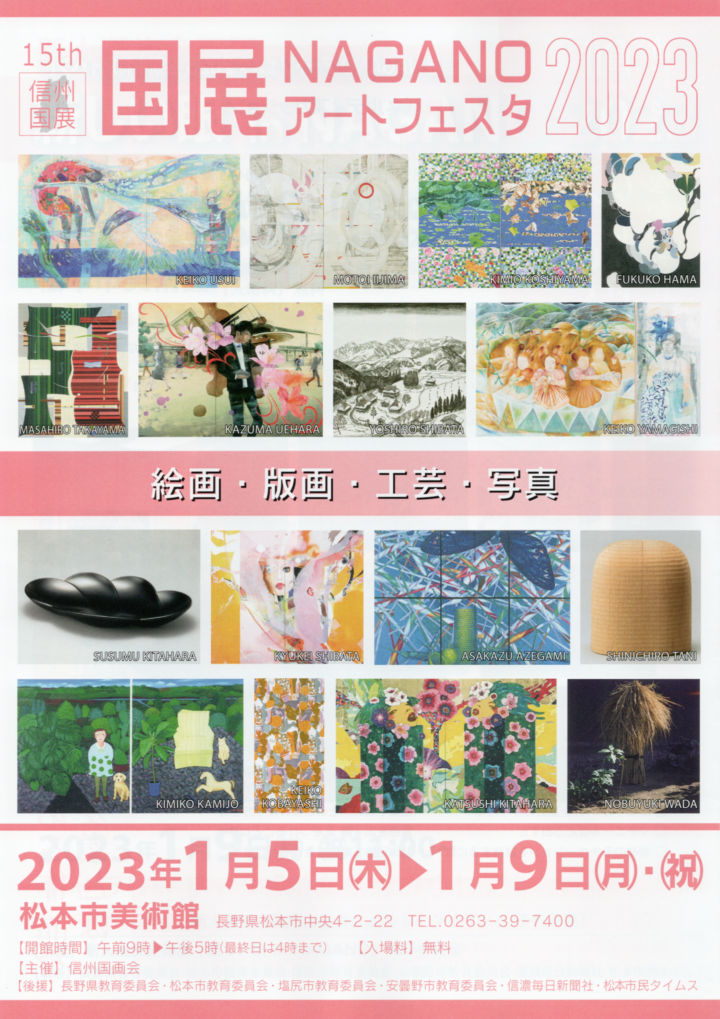 | 第15回 信州国展《国展NAGANOアートフェスタ2023》概要 | ■ 第15回 信州国展《国展NAGANOアートフェスタ2023》 会期 2023年1月5日〈木〉→1月9日〈月祝〉 会場 松本市美術館・入場料=無料 時間 午前9時→午後5時(最終日は4時まで) 主催 信州国画会 後援 長野県教育委員会、松本市教育委員会、塩尻市教育委員会、安曇野市教育委員会、信濃毎日新聞社、MGプレス、市民タイムス |