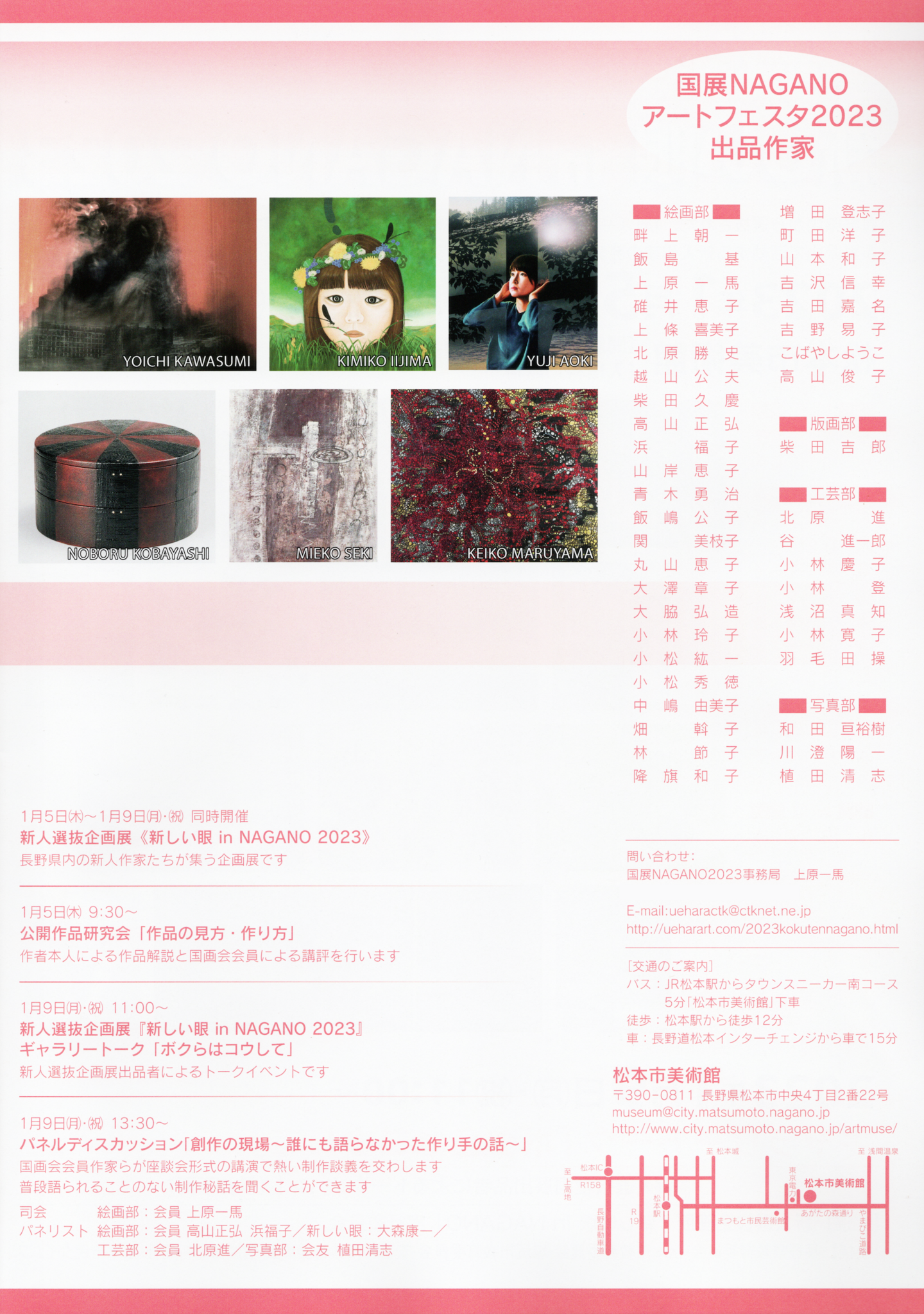 | 新人選抜企画展《新しい眼 in NAGANO 2023》 出品作家 | 〔絵画〕 石 井 知 佳 石 川 麻優子 岩 井 美 樹 大 澤 志 乃 大 森 康 一 塩 原 理絵子 高 寺 美 桜 滝 沢 美 穂 津 田 翔 一 野 田 ふ み バ バ モエナ 増 田 瑠 奈 油 井 祥 子 〔彫刻〕 山 田 実 穂 |