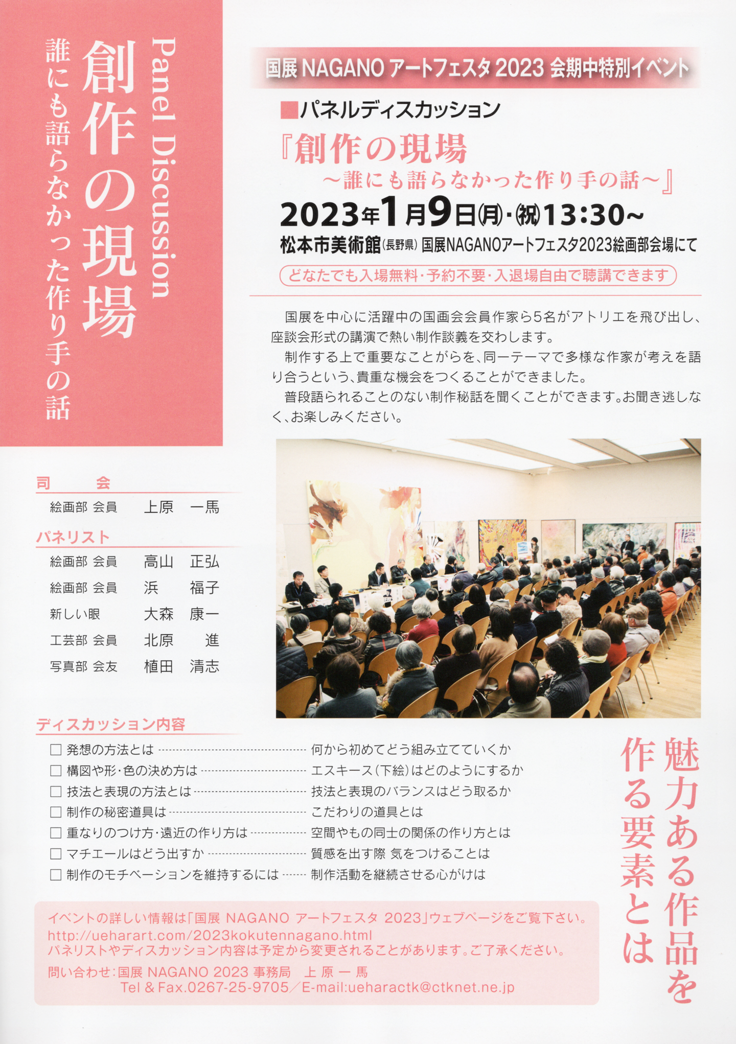 ・ ■パネルディスカッション「創作の現場~誰にも語らなかった作り手の話~」 2023年1月9日〈月祝〉13:30~ 国画会会員作家ら5名がアトリエを飛び出し、座談会形式の講演で熱い制作談義を交わします。 制作する上で重要なことがらを、同一テーマで多様な作家が考えを語り合うという、貴重な機会をつくることができました。普段語られることのない制作秘話を聞くことができます。 前回100数名以上が参加した人気のイベントです。作家のこころを聞いてみたい人や自分でも制作をしてみたい人におすすめです。お聞き逃しなく。 どなたでも無料・予約不要・入退場自由で聴講できます。 司 会 絵画部 会員‥‥上 原 一 馬 パネリスト 絵画部 会員‥‥高 山 正 弘 絵画部 会員‥‥浜 福 子 新しい眼 ‥‥大 森 康 一 工芸部 会員‥‥北 原 進 写真部 会友‥‥植 田 清 志 ディスカッション内容 □ 発想の方法とは 何から始めてどう組み立てるか □ 構図や形・色の決め方は エスキース(下絵)はどのようにするか □ 技法と表現の方法とは 技法と表現のバランスはどう取るか □ 制作の秘密道具は こだわりの道具とは □ 遠近・重なりのつけ方は 空間やもの同士の関係の作り方とは □ マチエールはどう出すか 質感を出す際 気をつけることは □ 制作のモチベーションを維持するには 制作活動を継続させる心がけは |