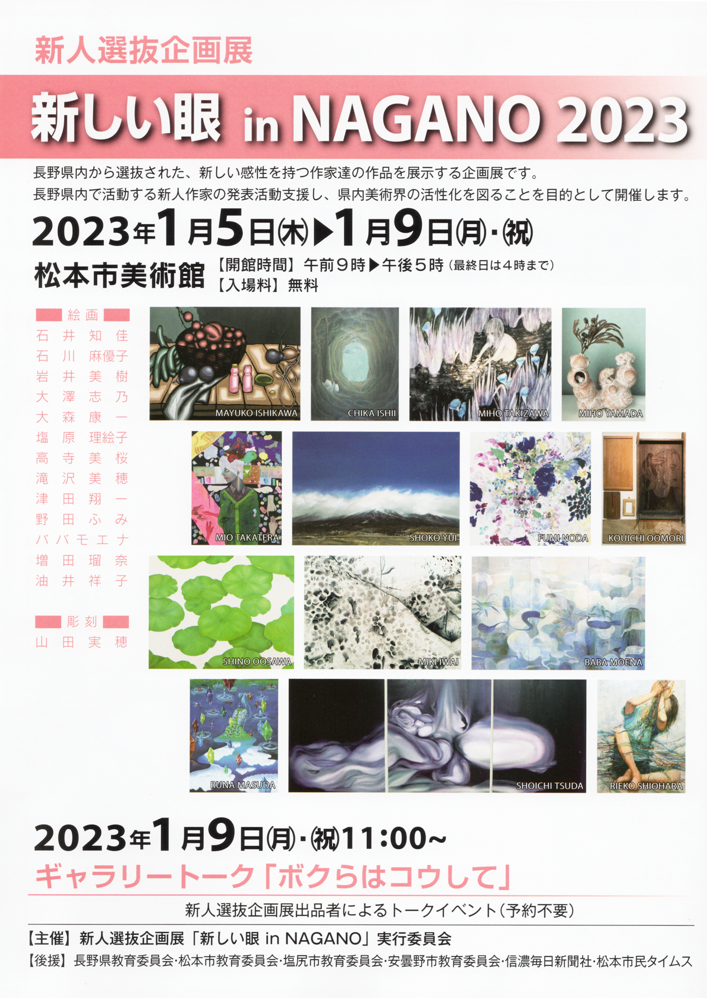 会期 2023年1月5日〈木〉→1月9日〈月祝〉 会場 松本市美術館・入場料=無料 時間 午前9時→午後5時(最終日は4時まで) 主催 新人企画展「新しい眼 in NAGANO」実行委員会 後援 長野県教育委員会、松本市教育委員会、塩尻市教育委員会、安曇野市教育委員会、信濃毎日新聞社、MGプレス、市民タイムス |
